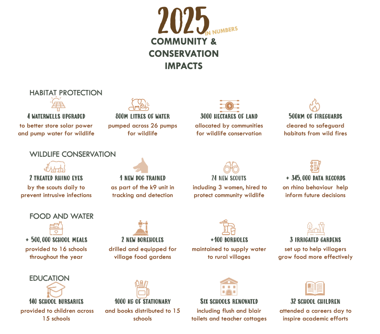 Conservation is often spoken about in terms of numbers - hectares protected, litres of water pumped, animals saved. But on the ground, conservation is deeply human. It is a mother drawing clean water from a borehole for the first time. A child receiving a school meal. A scout setting out at dawn to track rhino. A community discovering that wildlife is not a threat, but a future.